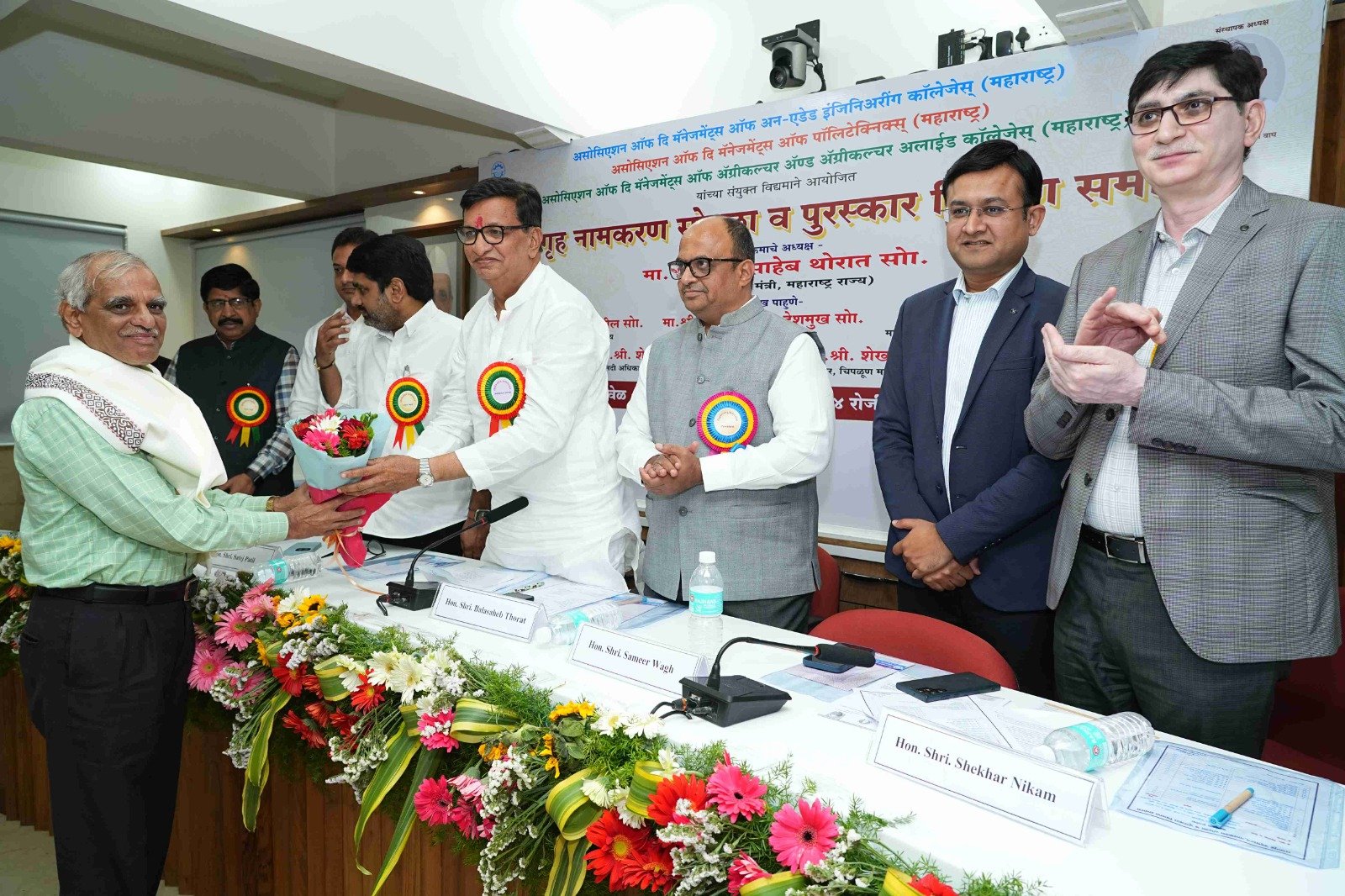 On behalf of the Polytechnic Association, President of Sanjeevani Rural Educational Society, Kopargaon, Hon. Mr. Nitin Shankarao Kolhe is awarded with “Hon.Shri. Balasaheb Wagh (Bhau) Memorial Life Time Achievement Award” by the former Revenue Minister of Maharashtra State Mr. Shri. Balasaheb Thorat in the presence of the former Minister of State for Home Affairs of Maharashtra State Hon. Mr. Mr. Satej (Bunty) Patil, President of the Association. Mr. Sameer Balasaheb Wagh, Treasurer Hon. Mr. Amit N. Kole and other dignitaries